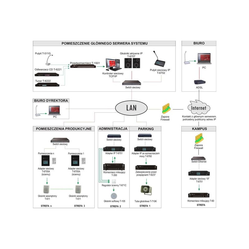 Podstawą działania systemu jest serwer (komputer klasy PC z zainstalowanym oprogramowaniem) oraz urządzenia podległe takie jak: adaptery sieciowe, pulpity mikrofonowe oraz aktywne głośniki systemu IP. System wykorzystuje przewody istniejącej lub projektowanej sieci LAN/WAN. Urządzenia systemu podłączane są do sieci tak, jak każde inne urządzenie sieciowe. Wszystkie elementy wyposażone są w wysokiej jakości przetworniki DSP. W urządzeniach aktywnych systemu IP zastosowano wzmacniacze pracujące w klasie D, których głównymi zaletami są wysoka sprawność energetyczna i niska masa.