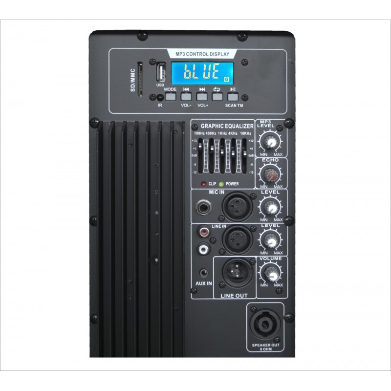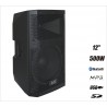 Aktywny zestaw 2-drożny o mocy 500W w nowoczesnej obudowie ze wzmacnianego tworzywa sztucznego. Wbudowany zdalnie sterowany pilotem IR odtwarzacz Mp3 z funkcją nagrywania w formatach MP3, WMA, wyposażony w wejście pamięci USB, łącze bezprzewodowe Bluetooth oraz odbiornik radiowy FM.