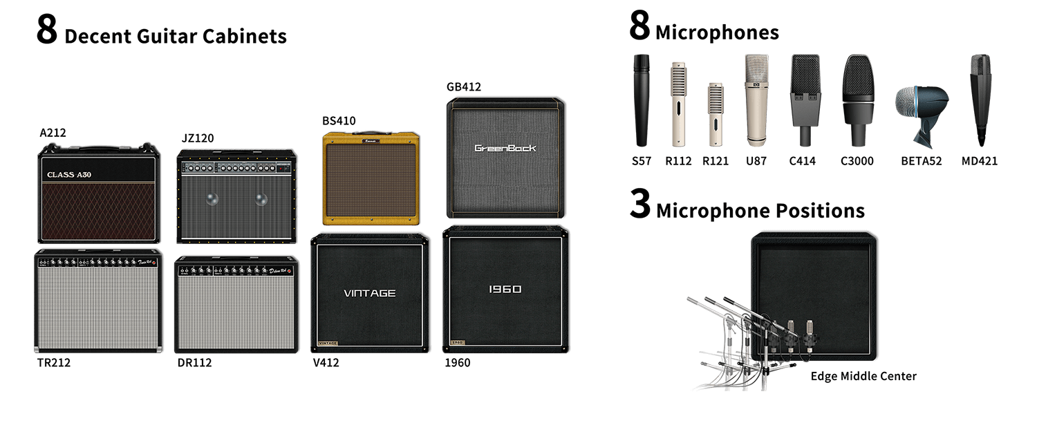 NUX MG-30 zapewnia 30 symulatorów wzmacniaczy, w tym 25 dedykowanych do gitary elektrycznej, 3 basowe i 2 akustyczne. W tym wypadku mniej znaczy więcej – skupiono się na klasycznych, najbardziej pożądanych modelach. Ustawiając nasze brzmienie mamy do wyboru gotowe symulacje kolumn IR: 8 gitarowych, 8 basowych i 3 IR akustyczne, z dodatkową możliwością wyboru spośród 8 różnych mikrofonów w 3 różnych pozycjach. Istnieje też możliwość wgrania własnych symulacji IR.